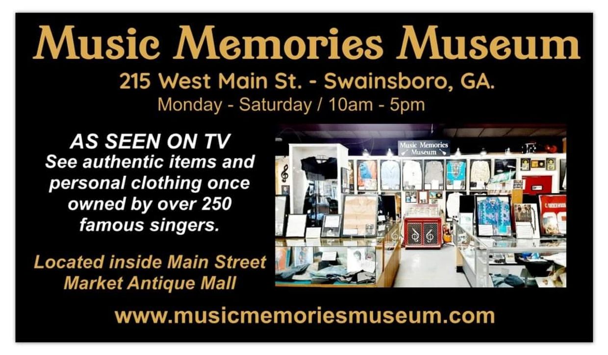 AS SEEN ON TV...The Music Memories Museum is owned by Michael Bright and is one of the largest private collections of it's kind. You will see hundreds of authentic items and personal clothing once owned by the biggest names in the music industry. The Museum is located inside Main Street Market Antique Mall in Downtown Swainsboro, Georgia.